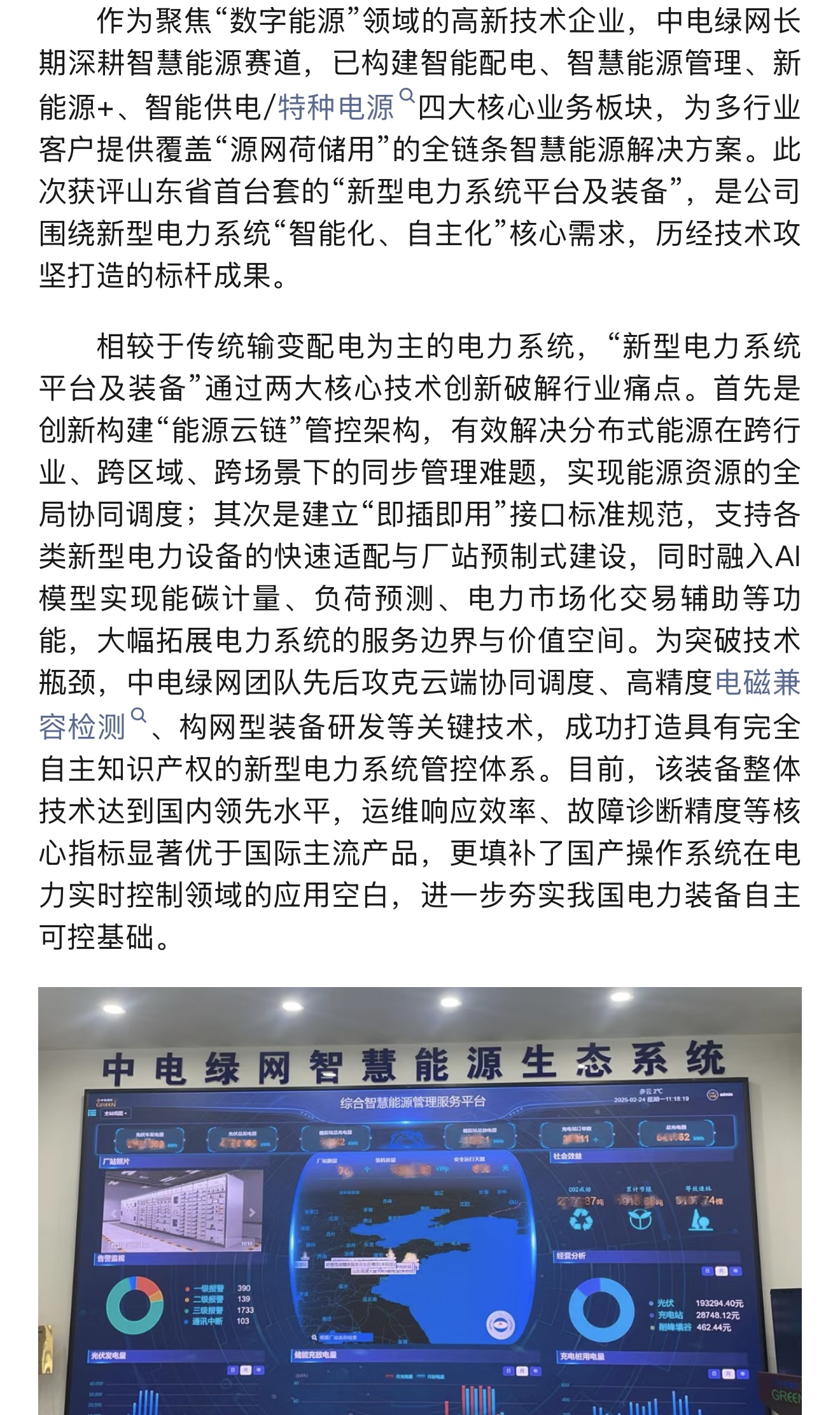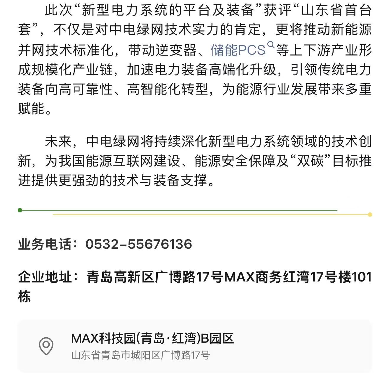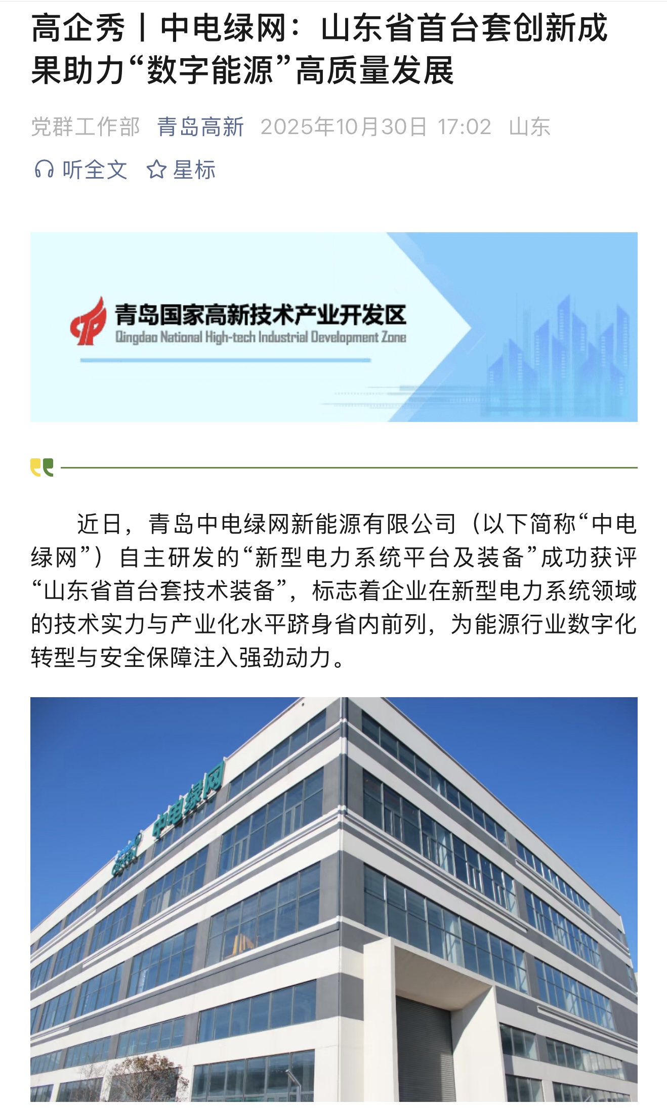 2025年10月30日,青岛高新公众号发布一篇“中电绿网:山东省首台套创新成果助力“数字能源”高质量发展”报道,具体内容如下: